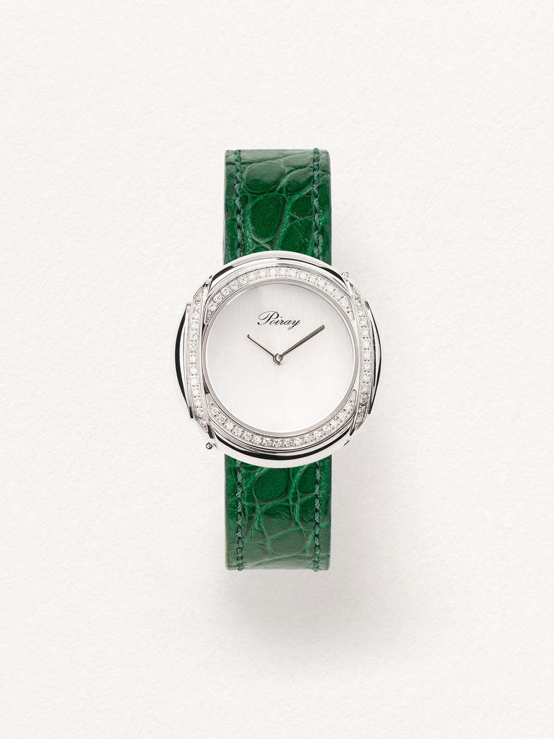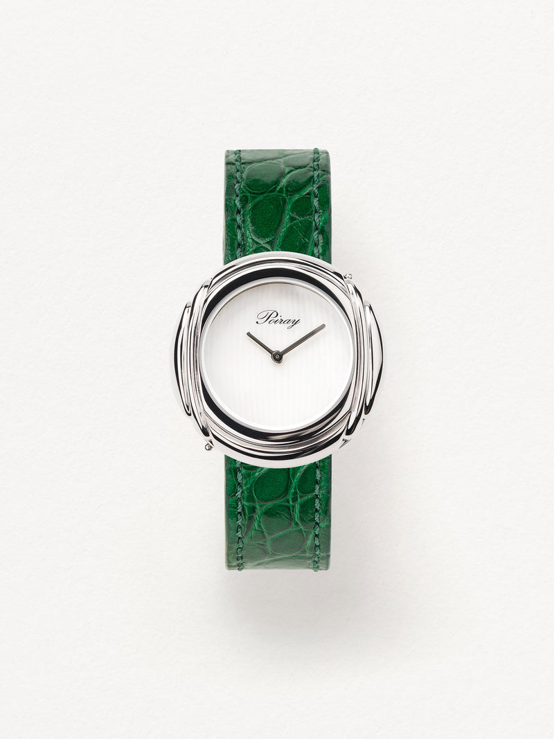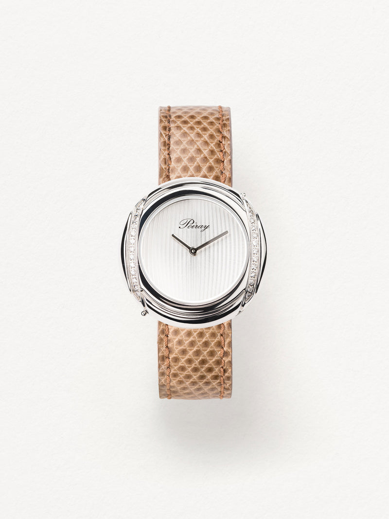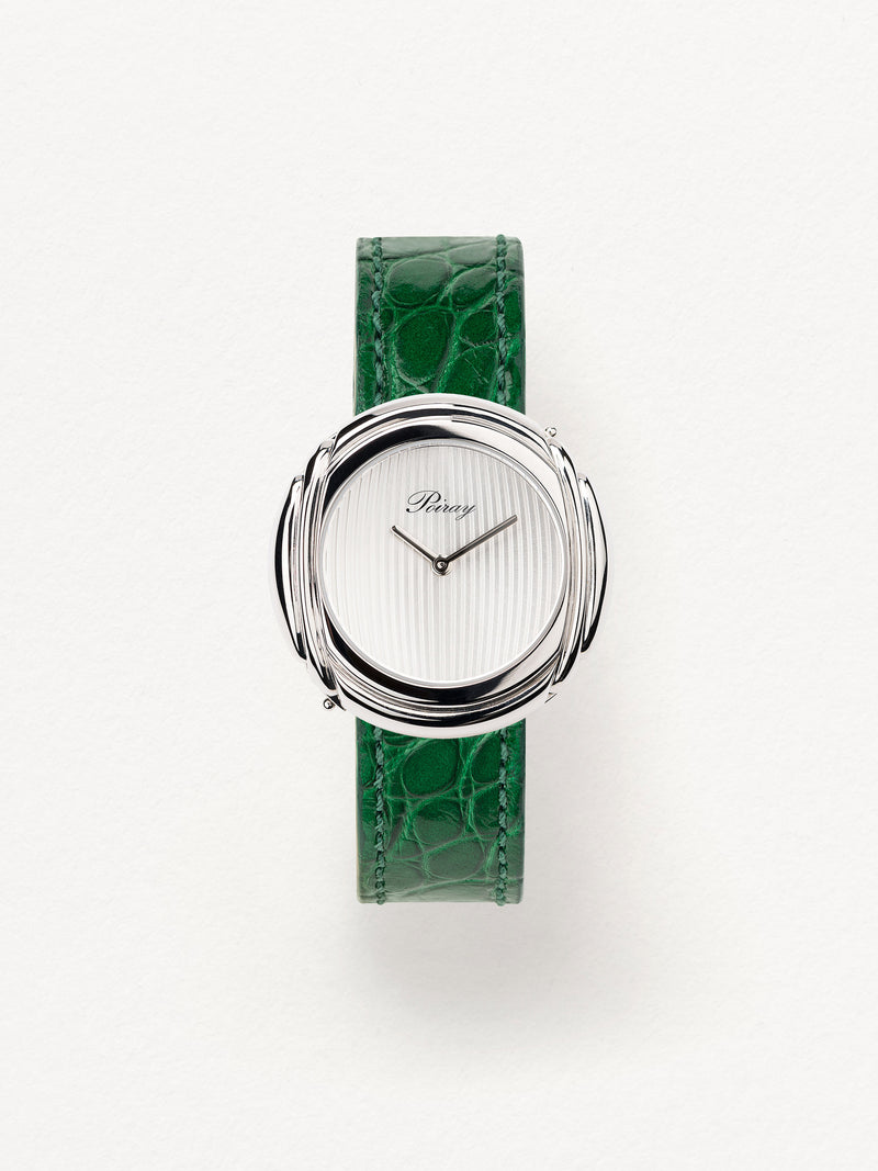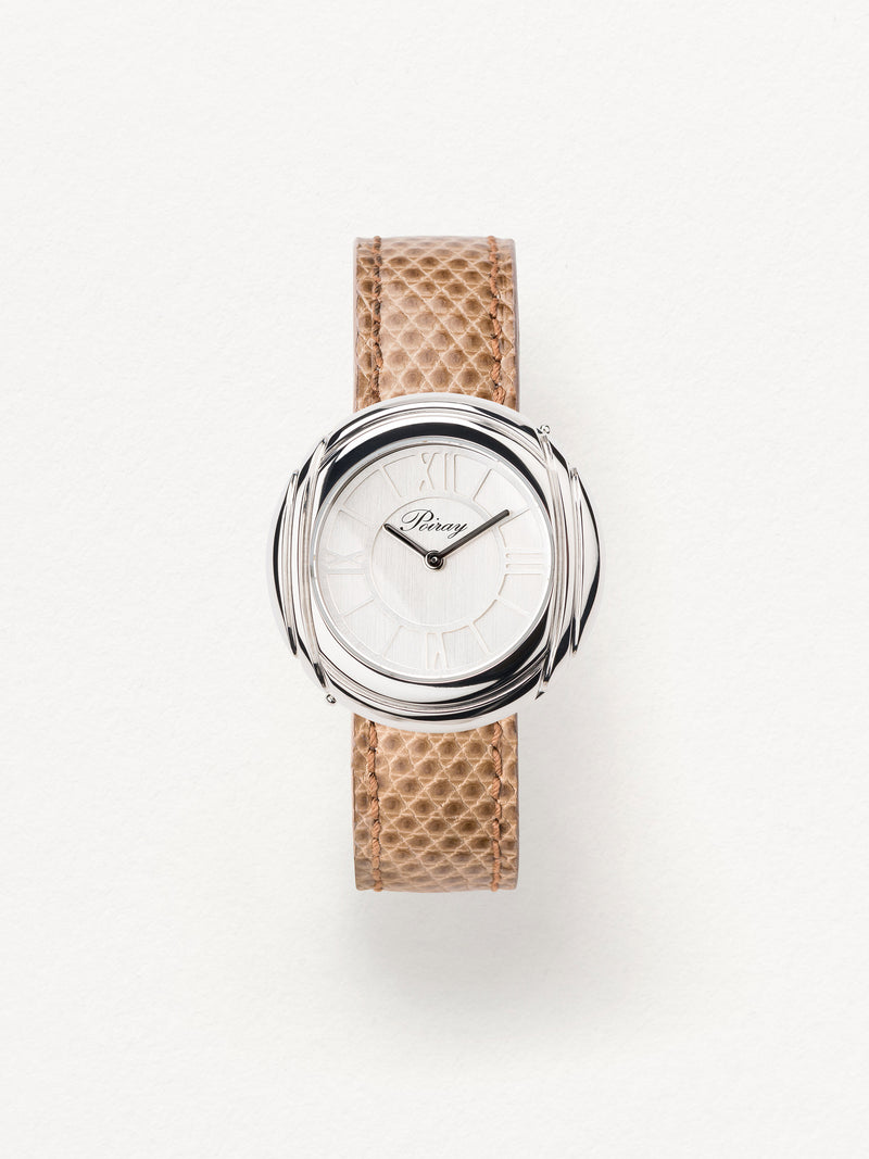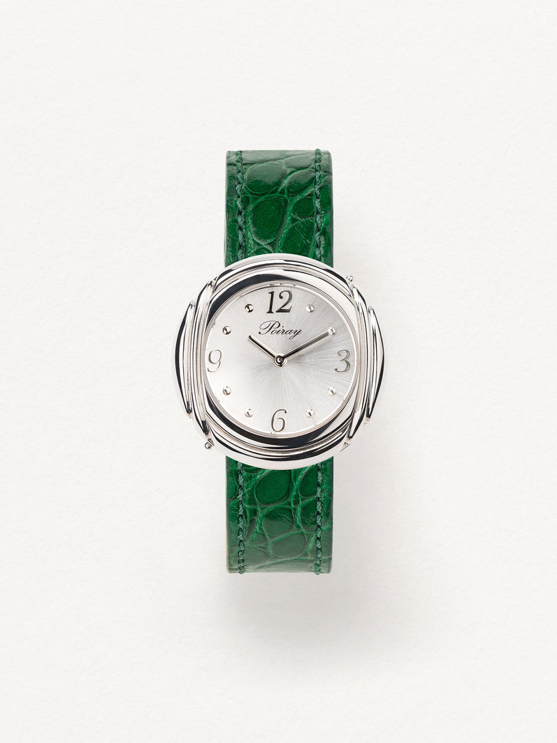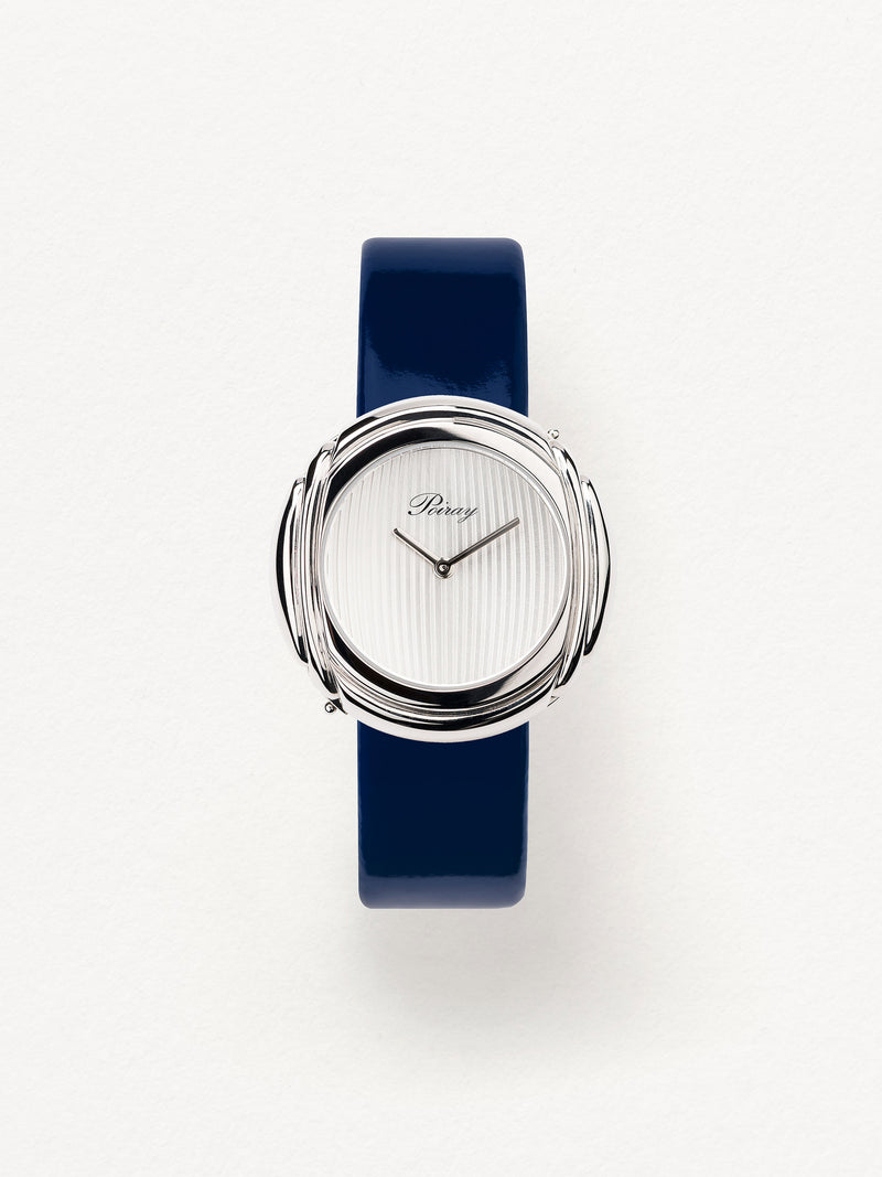 Playing with colors and materials, the Rive Droite watch, elegant and generous, changes outfit thanks to its interchangeable straps.