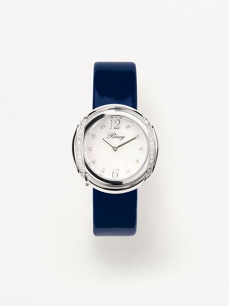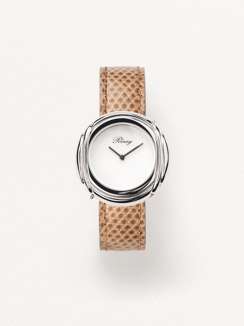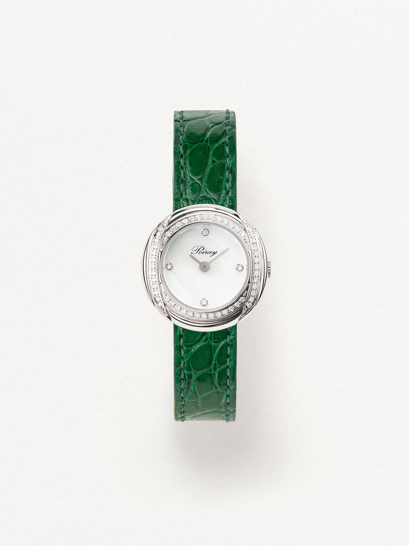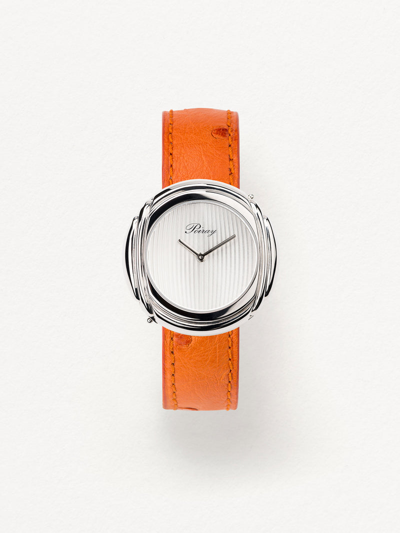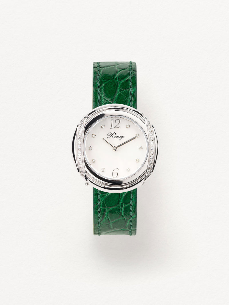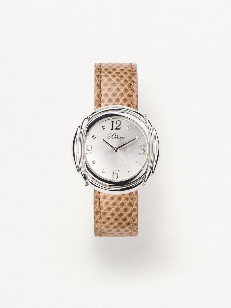 Playing with colors and materials, the Rive Droite watch, elegant and generous, changes outfit thanks to its interchangeable straps.