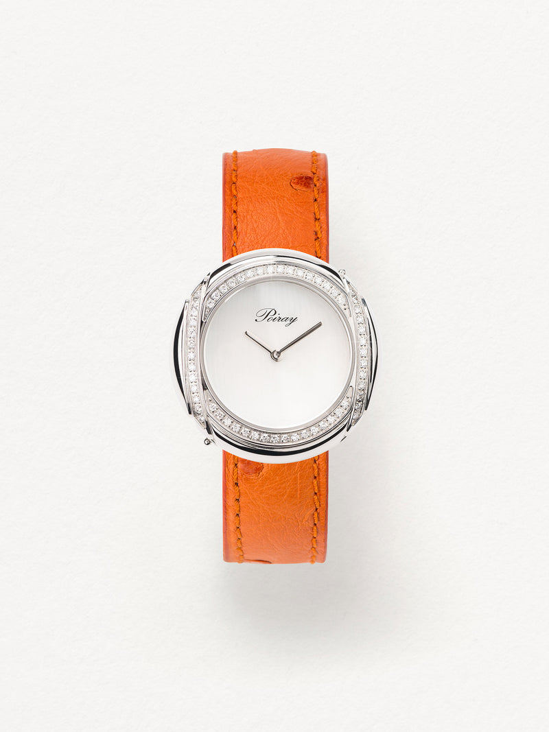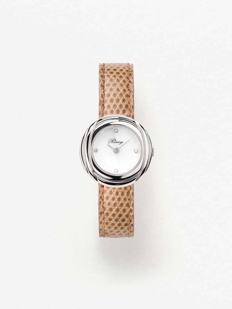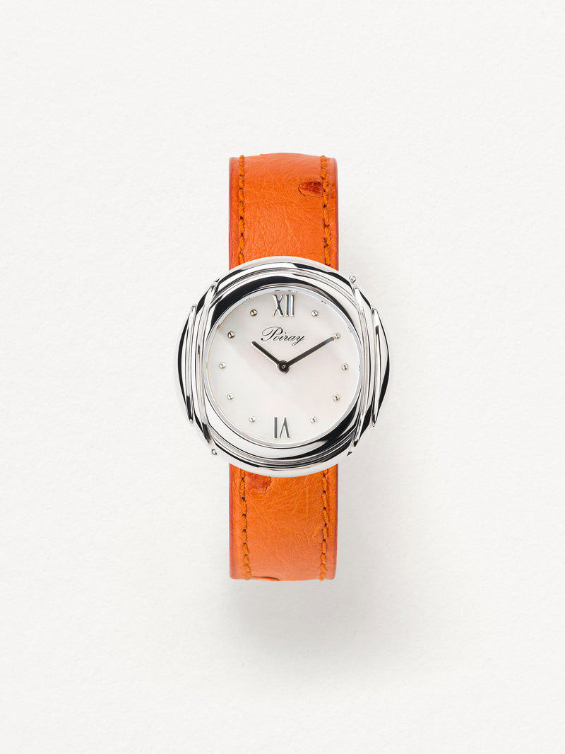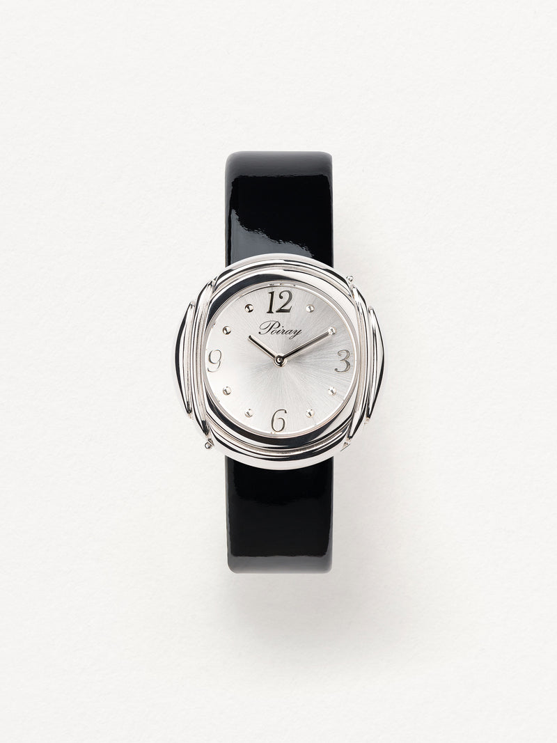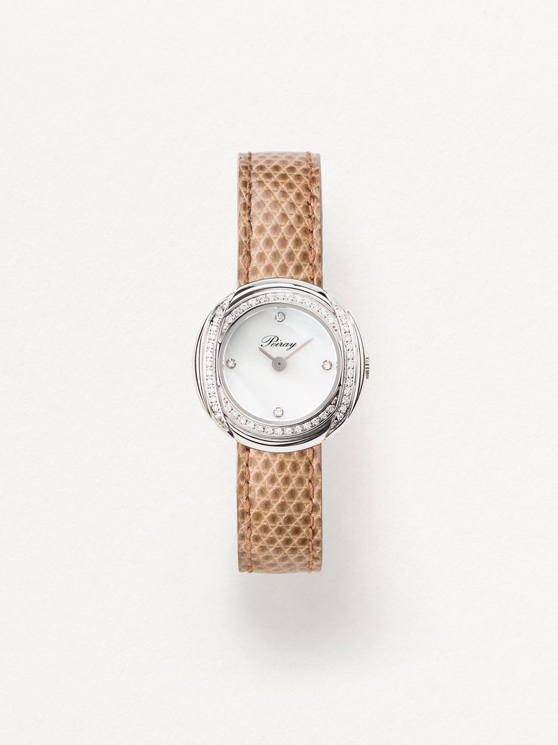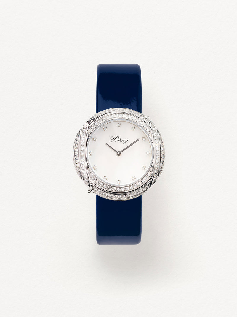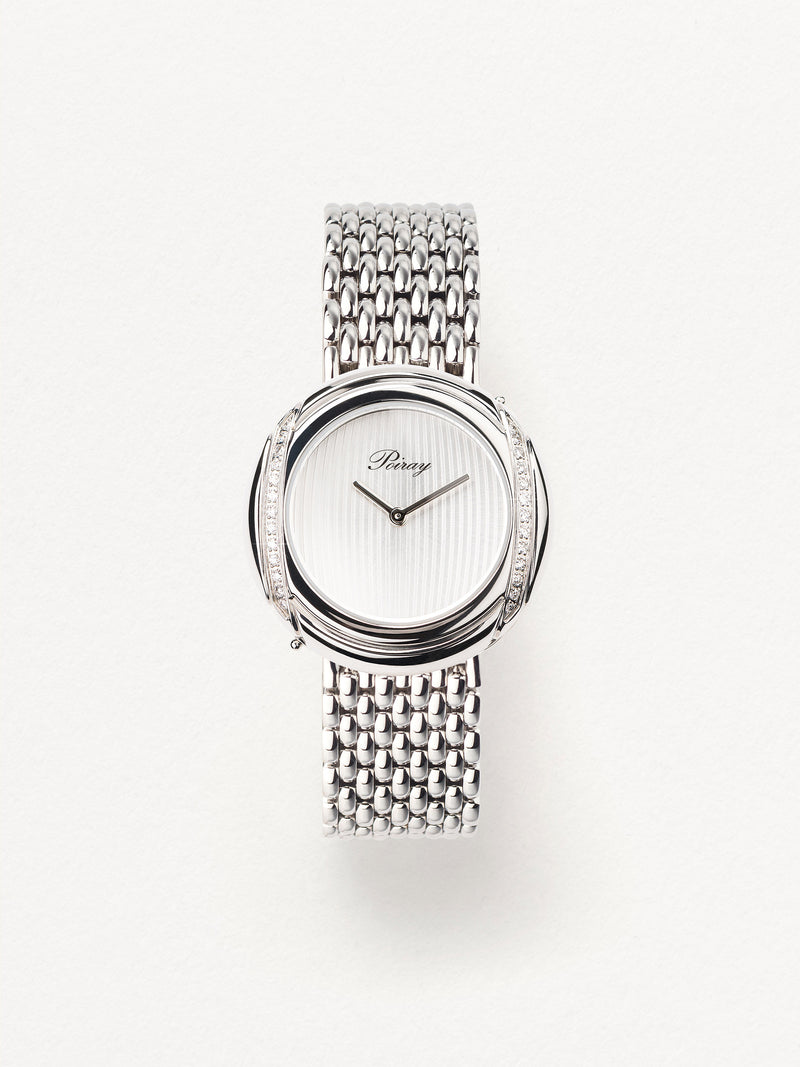 Playing with colors and materials, the Rive Droite watch, elegant and generous, changes outfit thanks to its interchangeable straps.
