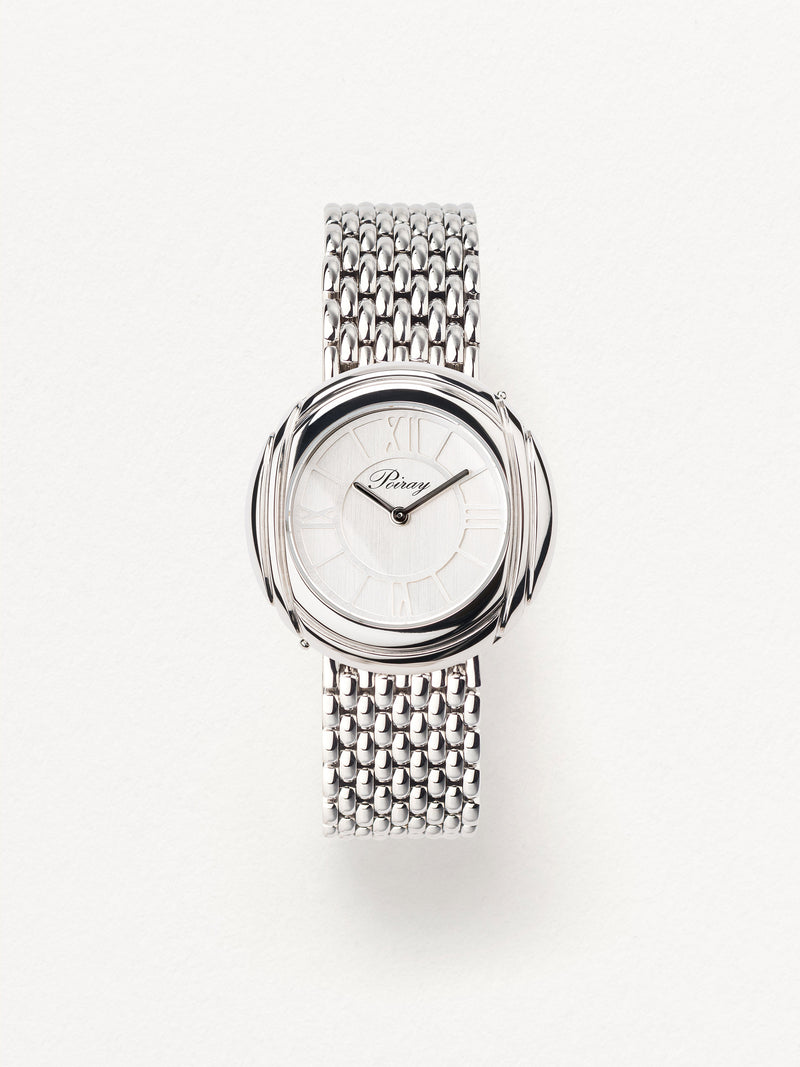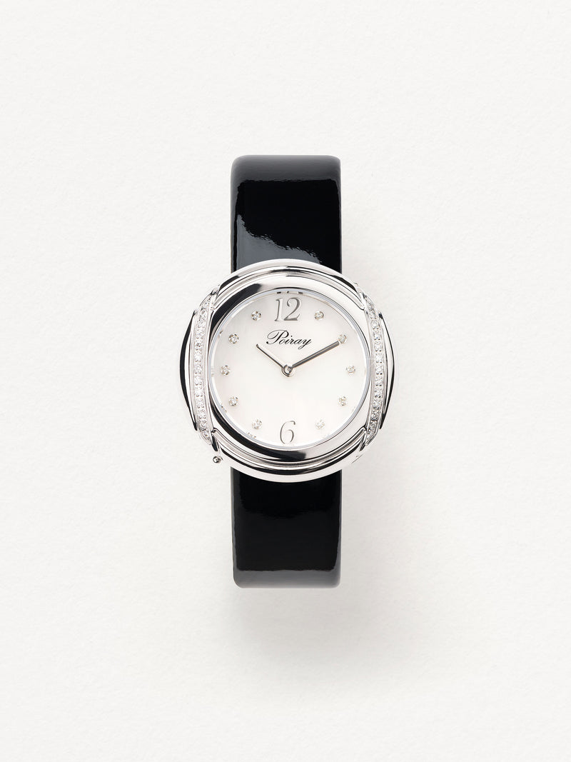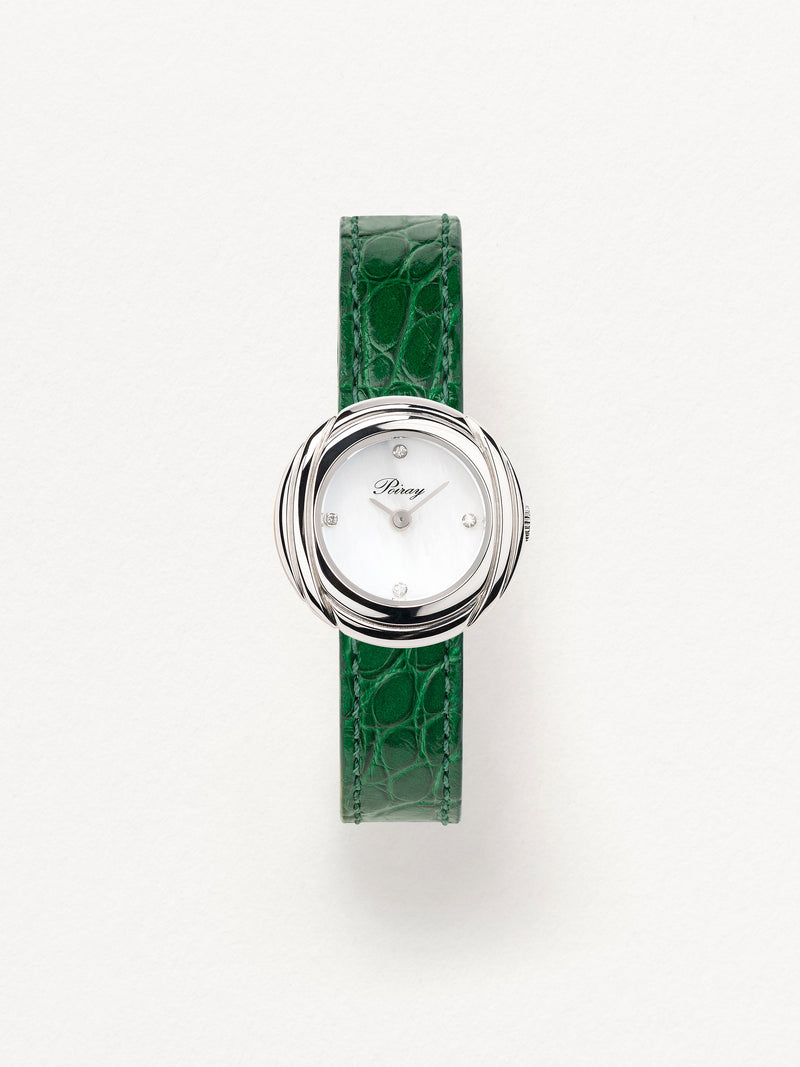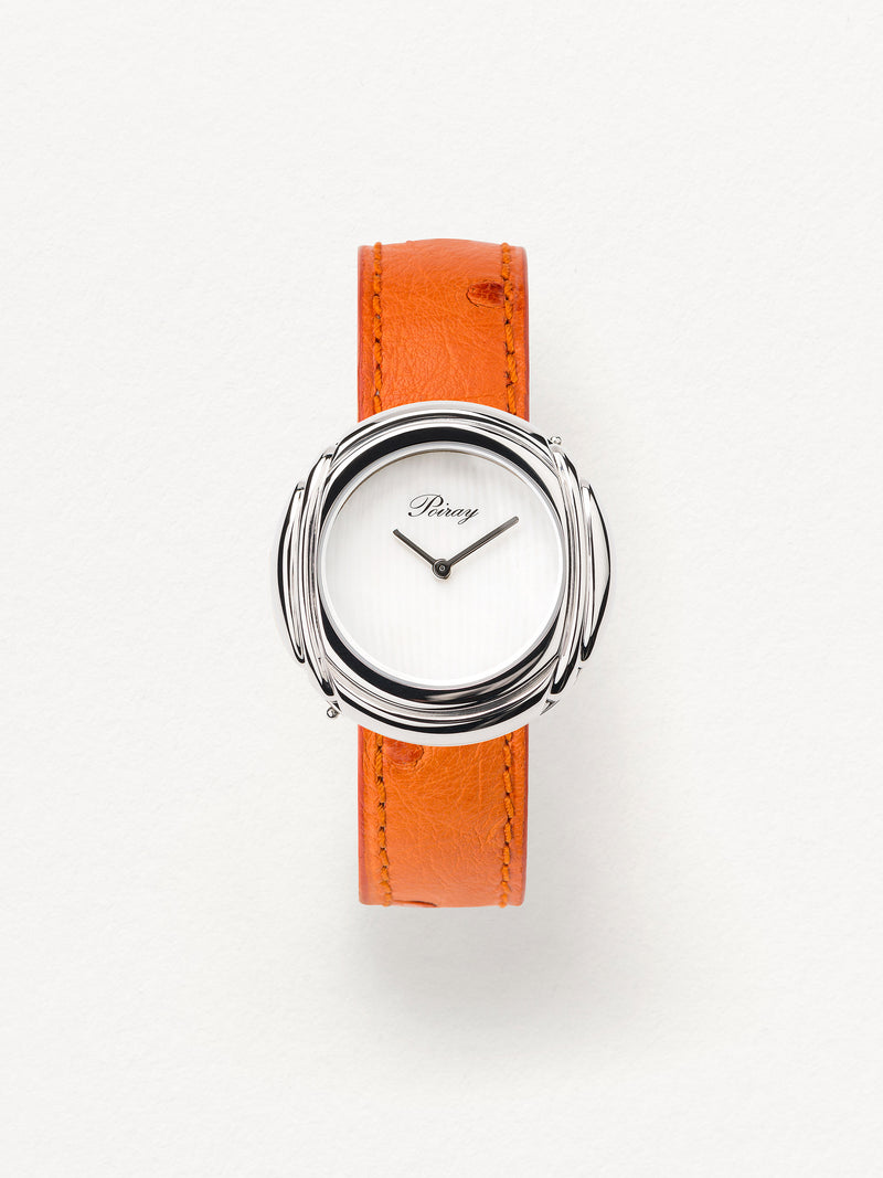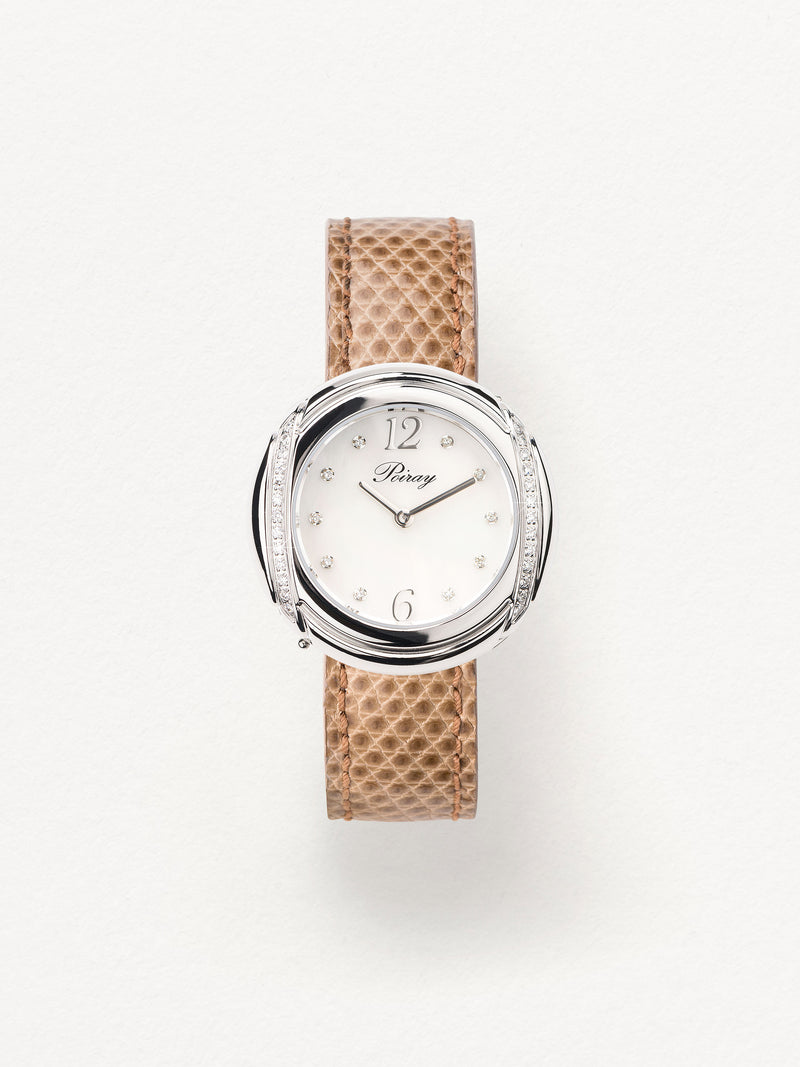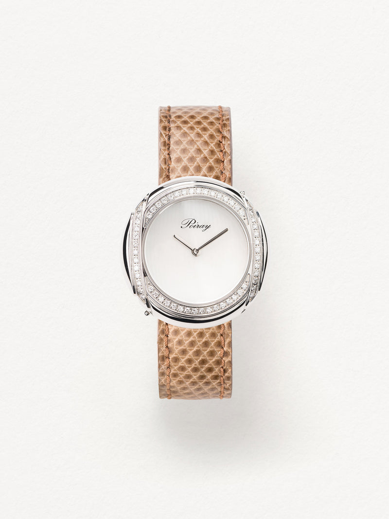 Playing with colors and materials, the Rive Droite watch, elegant and generous, changes outfit thanks to its interchangeable straps.