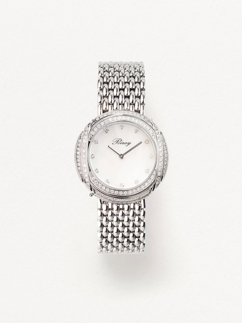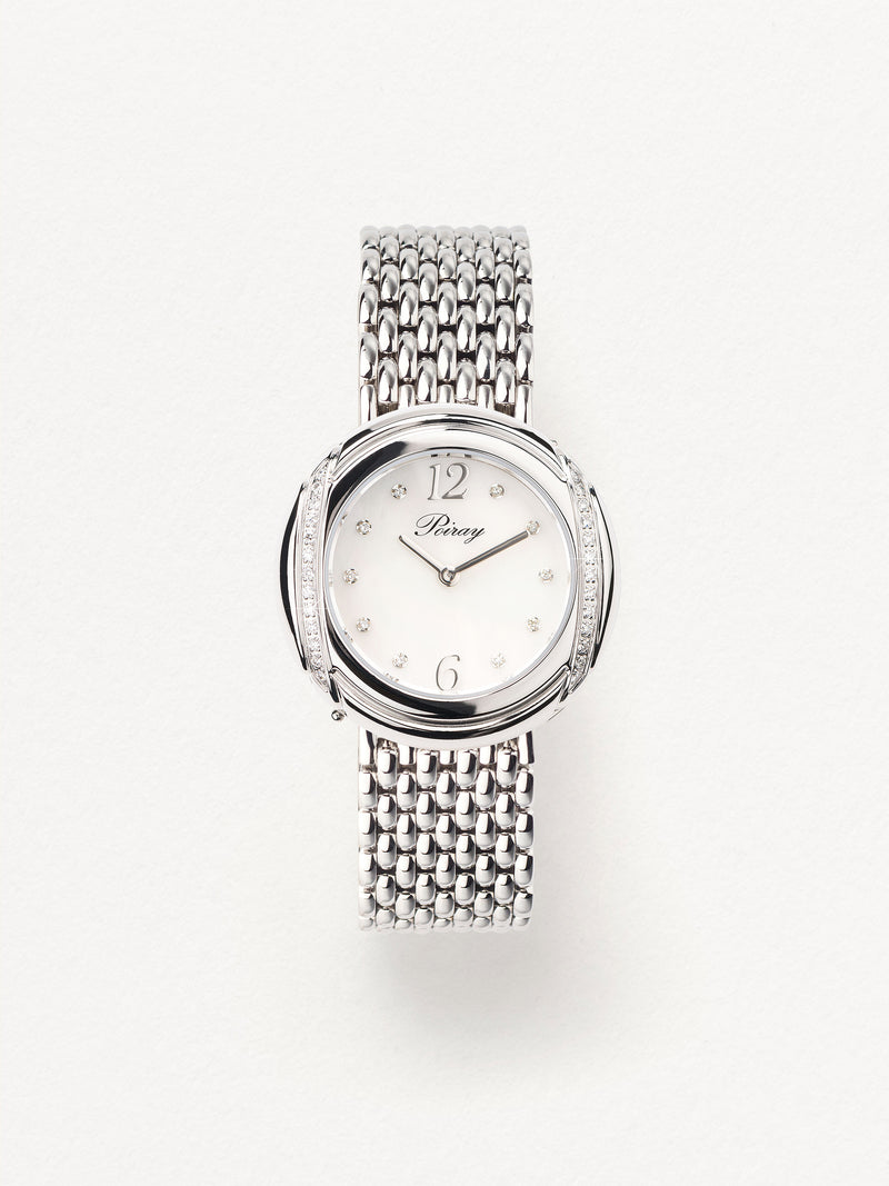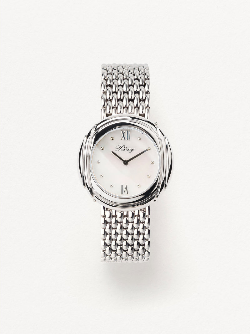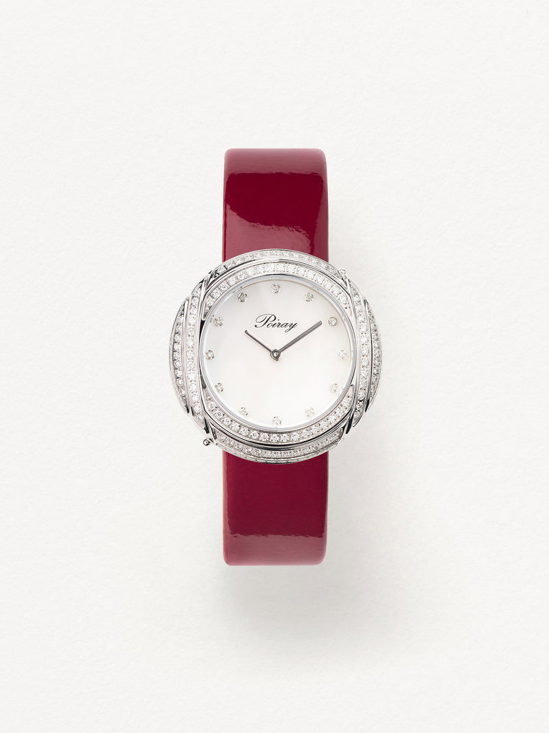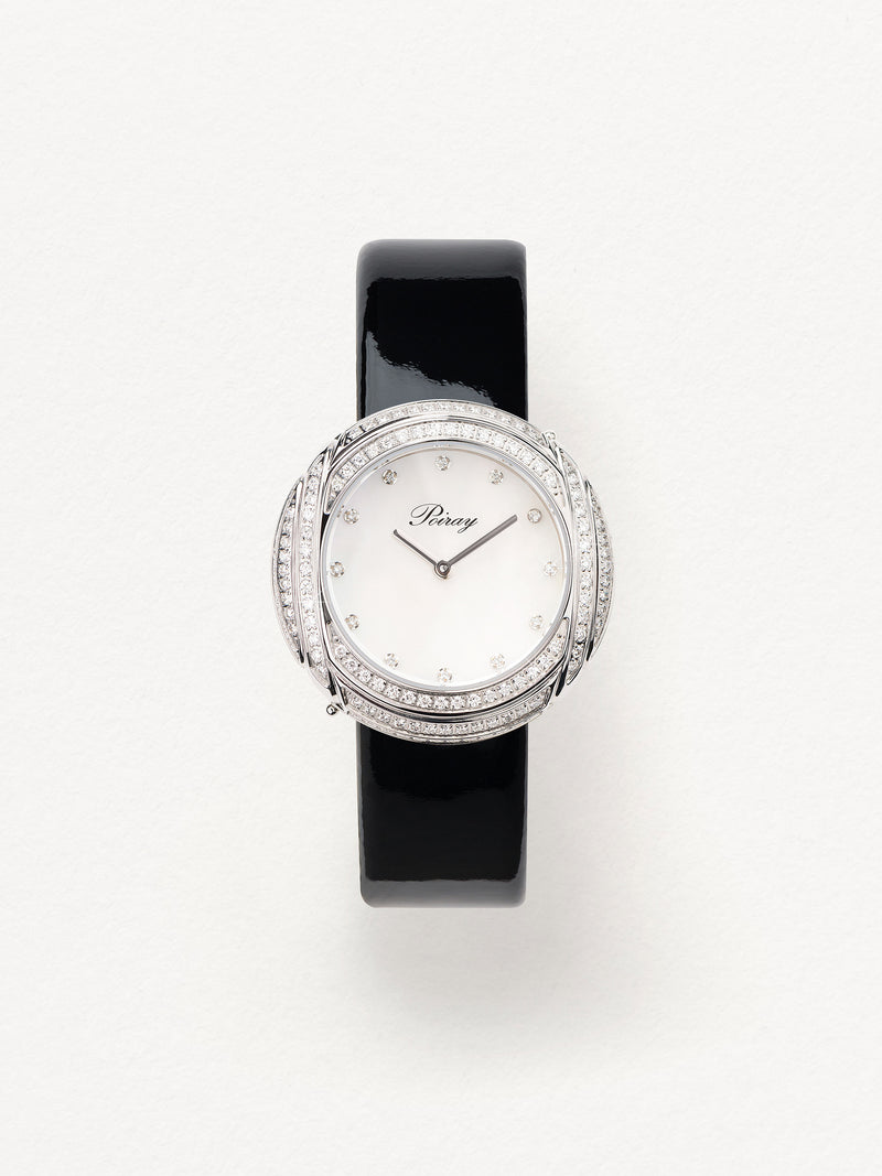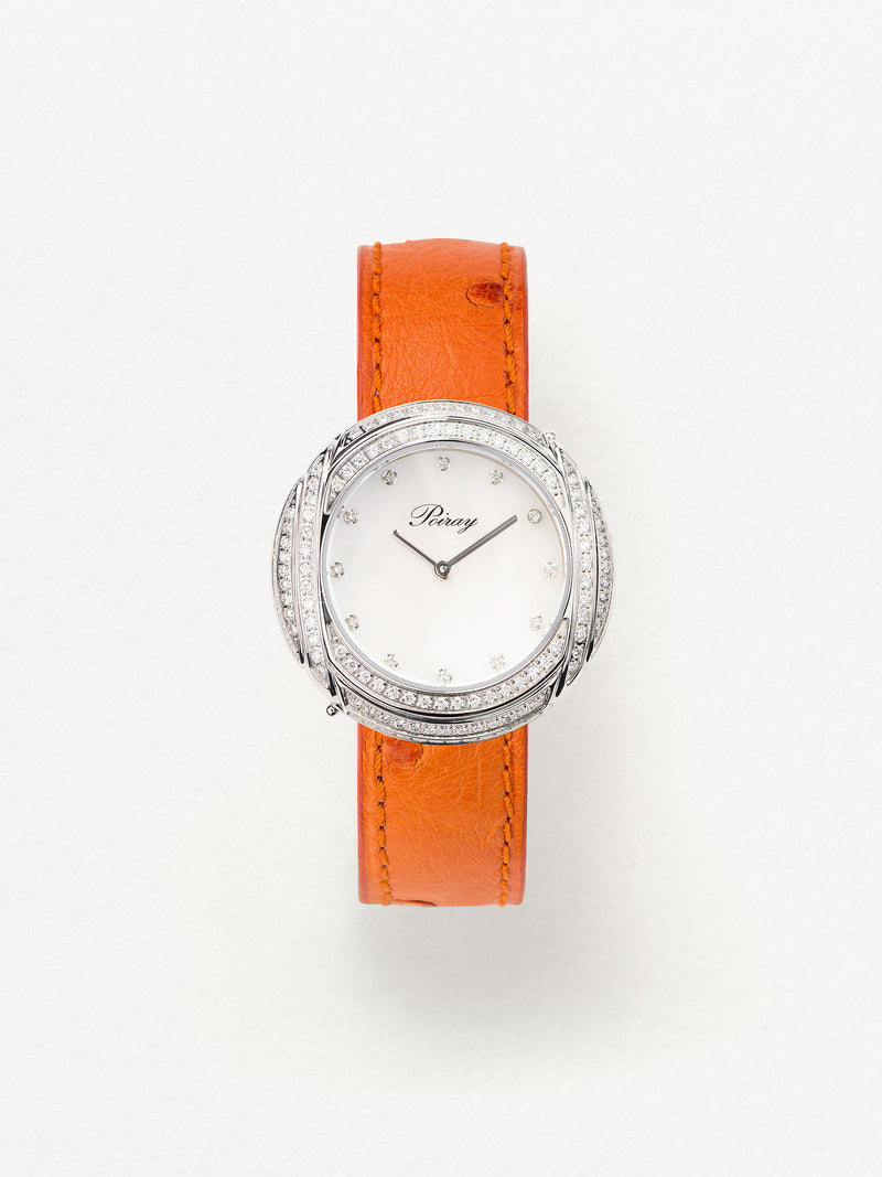 Playing with colors and materials, the Rive Droite watch, elegant and generous, changes outfit thanks to its interchangeable straps.
